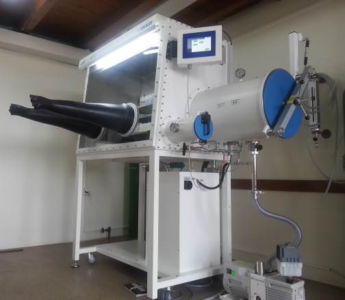 It is equipped by a planetary mill and a glove box with nanoparticle handling in inert atmosphere, which makes it convenient for work with flammable and unstable materials.