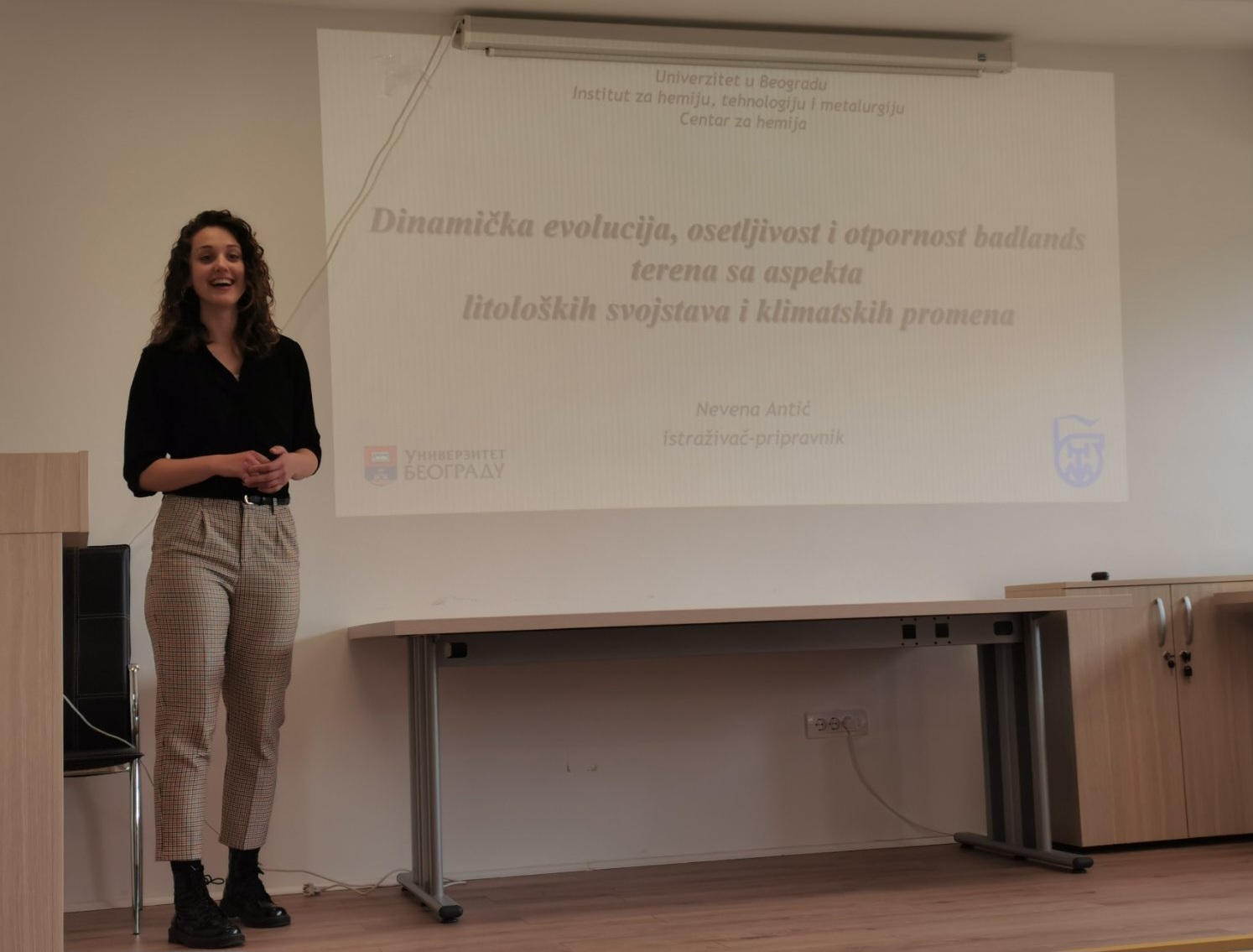 U okviru ciklusa predavanja doktoranada Centra za hemiju IHTM, 06. aprila 2023. koleginica Nevena Antić održala je predavanje pod nazivom „Dinamička evolucija, osetljivost i otpornost badlands terena sa aspekta litoloških svojstava i klimatskih promena“.