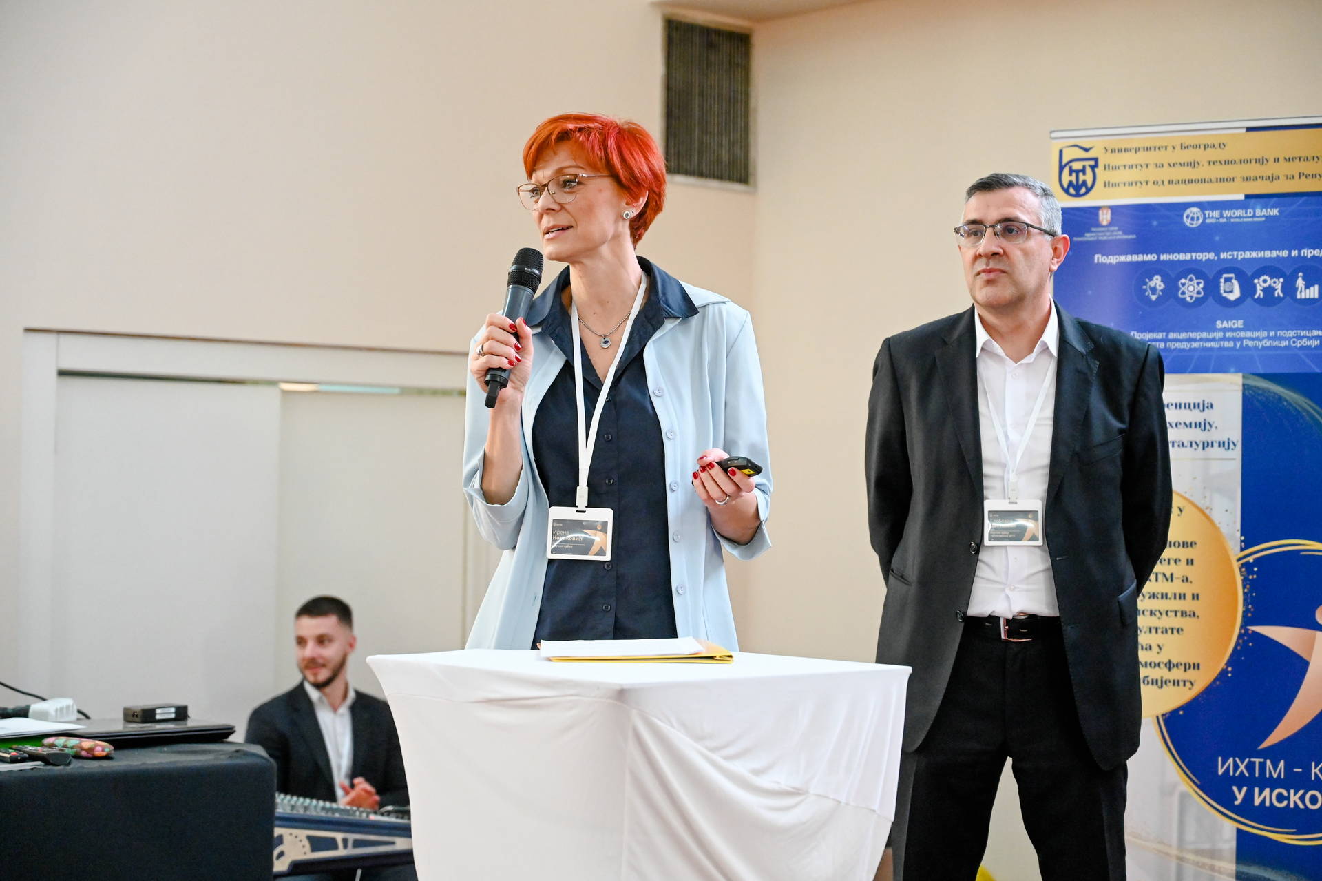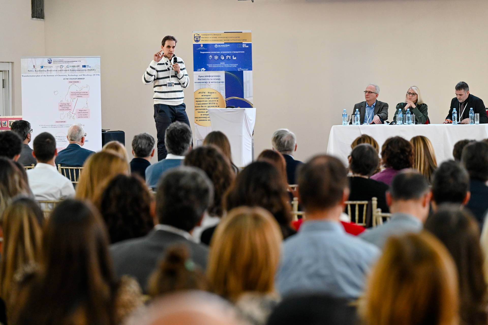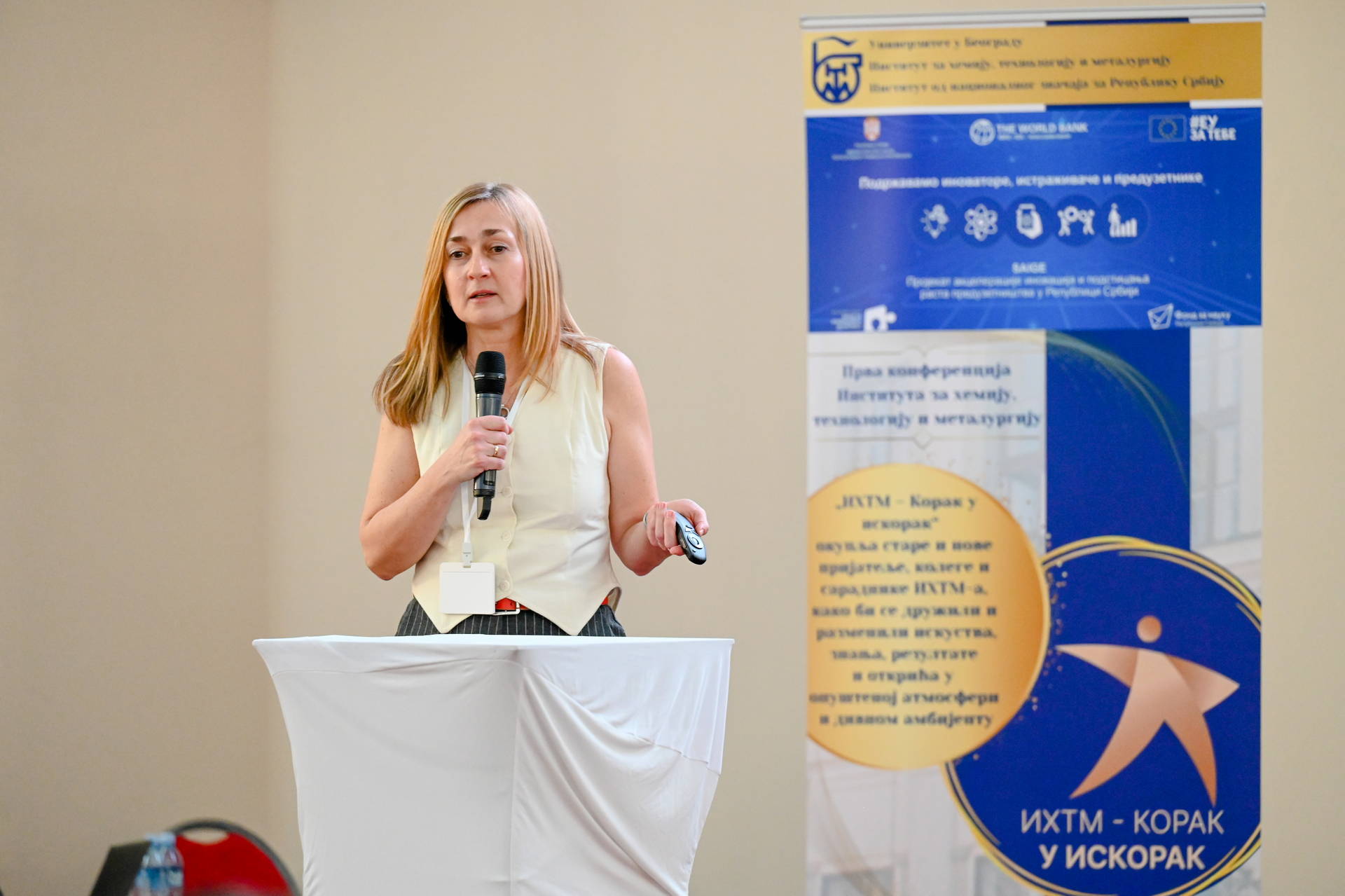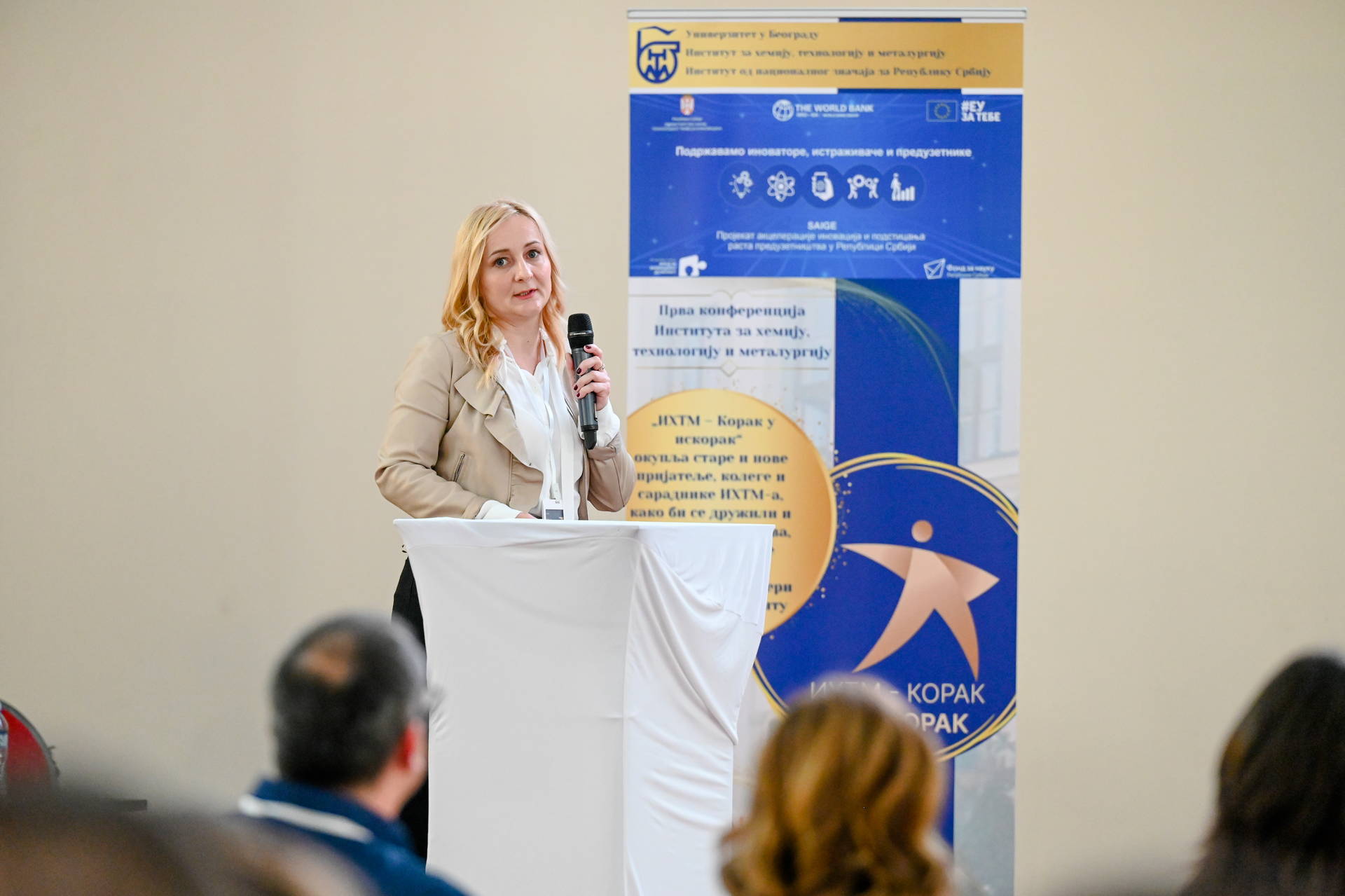 Prva interna naučna konferencija Instituta za hemiju, tehnologiju i metalurgiju održana je pod pokroviteljstvom Projekta akceleracije inovacija i podsticanja rasta preduzetnistva u Republici Srbiji (Serbia Accelerating Innovation and Entrepreneurship Project – SAIGE). SAIGE projekat, koji sprovodi Ministarstvo nauke, tehnološkog razvoja i inovacija Republike Srbije uz partnerstvo sa Svetskom bankom i Evropskom unijom, daje podršku transformaciji naučnih instituta u Srbiji, među kojima je i IHTM. Tokom prve godine transformacije IHTM, kroz SAIGE projekat unapređeni su mnogi organizacioni i komunikacioni procesi, osnovana je Kancelarija za projekte i međunarodnu saradnju IHTM i Telo za transfer tehnologije IHTM. Prvi rezultati transformacije se ogledaju u većoj stopi uspešnosti u dobijenim kompetetivnim projektima u odnosu na prethodne godine, kao i povećana saradnja sa privredom uključujući i konsultantske usluge. Pozitivni efekti transformacije posebno se ogledaju u jačanju motivacije zaposlenih i boljeg međusobnog povezivanja čiji je ishod između ostalog i događaj „IHTM - Korak u iskorak.“