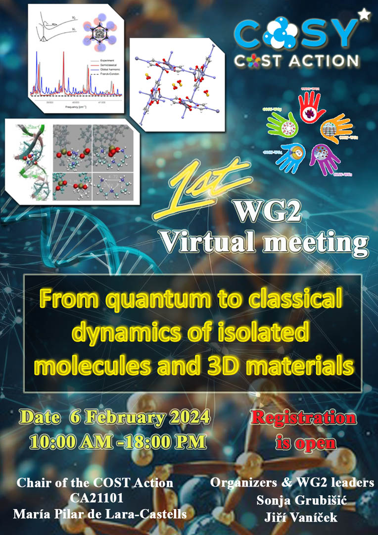 Zadovoljstvо nam je da objavimo da će prvi online WG2 naučni skup COST Akcije COSY (CA21101) pod nazivom „From quantum to classical dynamics of isolated molecules and 3D materials“ održati 6. februara 2024. Očekuje se učešće do 50 učesnika iz inostranstva i Beograda. Za konferenciju se mogu prijaviti doktoranti, post-doktoranti, kao i zaposleni naučnici. Cilj skupa je da okupi vodeće eksperte iz oblasti klasične i kvantne dinamike u primeni modelovanja izolovanih molekula ili ograničenih molekulskih sistema, da podele svoja iskustva u vezi sa njihovim najnovijim istraživanjima.
